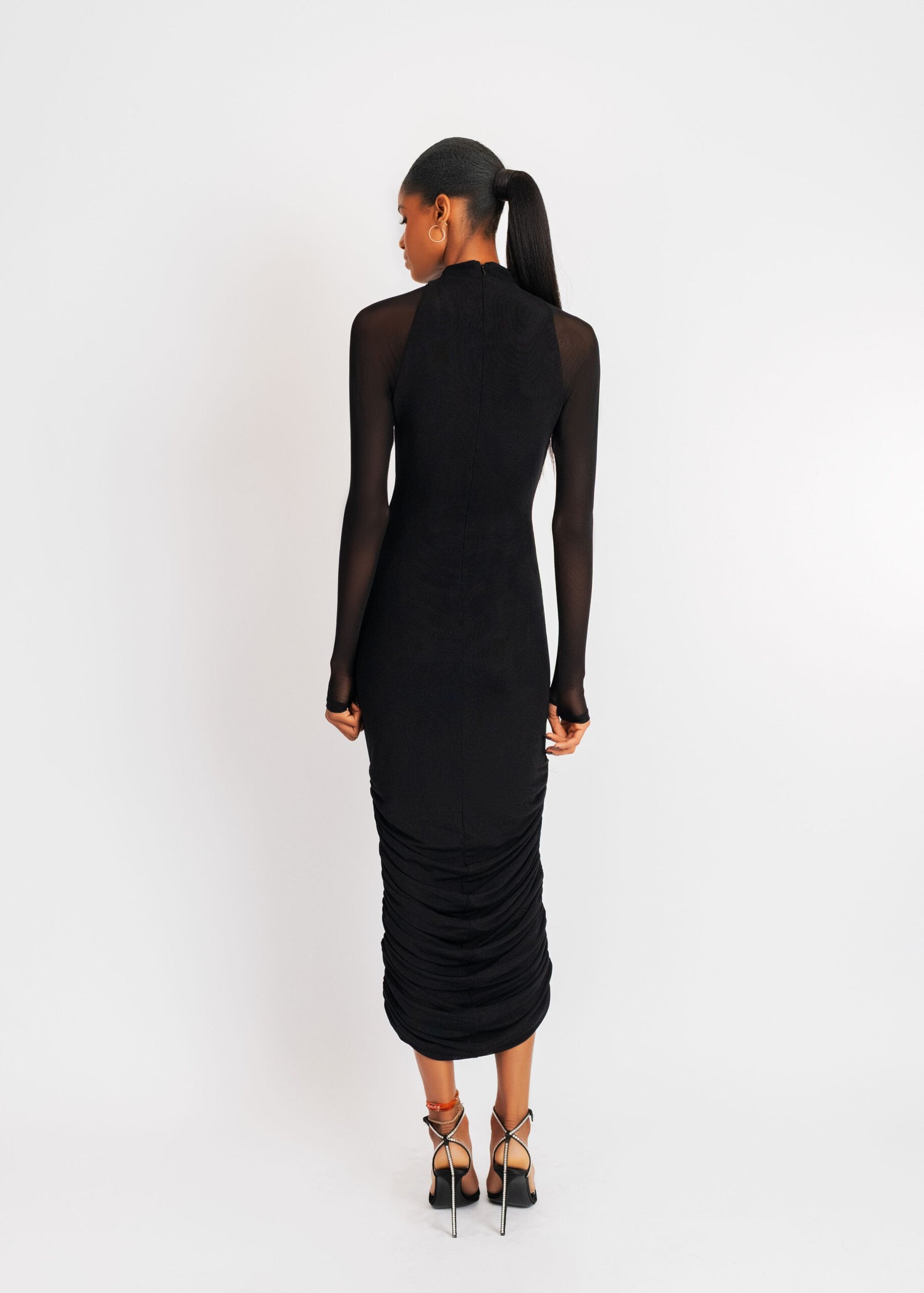 The Eli black dress runs to a midi length with ruffles elastic at both side seam to give a draping and balloon effect , the high neck line gives an illusion of a slender enlongated feminine look with a full sleeve featuring a thumb hole .